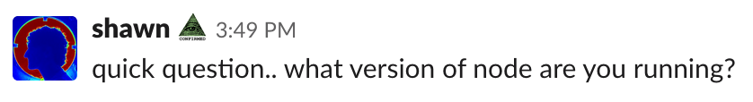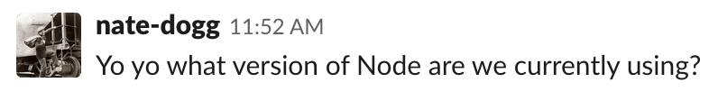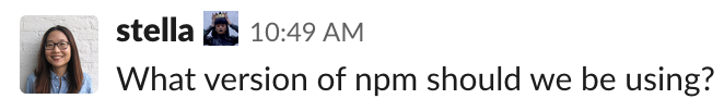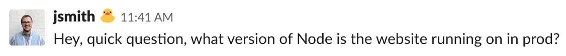 Since these dependencies are handled at the global level, versioning these dependencies across our teams provided more challenges than versioning our local dependencies. Every month, someone would hop onto Slack and ask “What version of Node/npm are we running?”